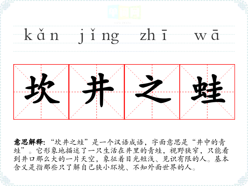 “坎井之蛙”是一个汉语成语,字面意思是“井中的青蛙”。它形象地描述了一只生活在井里的青蛙,视野狭窄,只能看到井口那么大的一片天空,象征着目光短浅、见识有限的人。基本含义是指那些只了解自己狭小环境、不知外面世界的人。