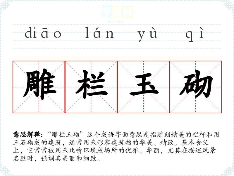 “雕栏玉砌”这个成语字面意思是指雕刻精美的栏杆和用玉石砌成的建筑,通常用来形容建筑物的华美、精致。基本含义上,它常常被用来比喻环境或场所的优雅、华丽,尤其在描述风景名胜时,强调其美丽和细致。