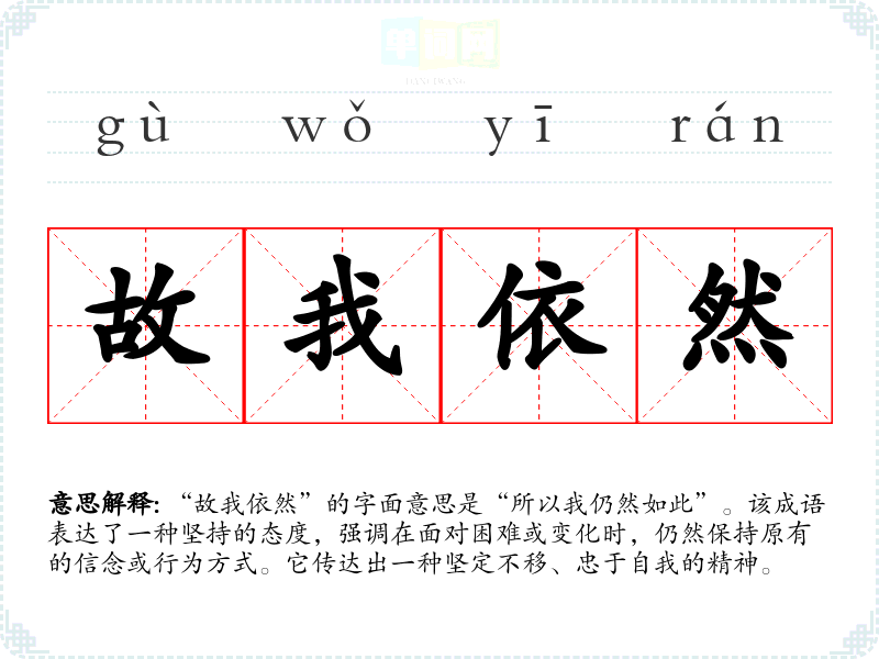 “故我依然”并非传统成语,可能源自于某些文学作品或现代语境中的表达。其构造中的“故”表示因果关系,而“依然”则指保持不变,合在一起可以理解为“因为某种原因,所以我依旧保持原样”。