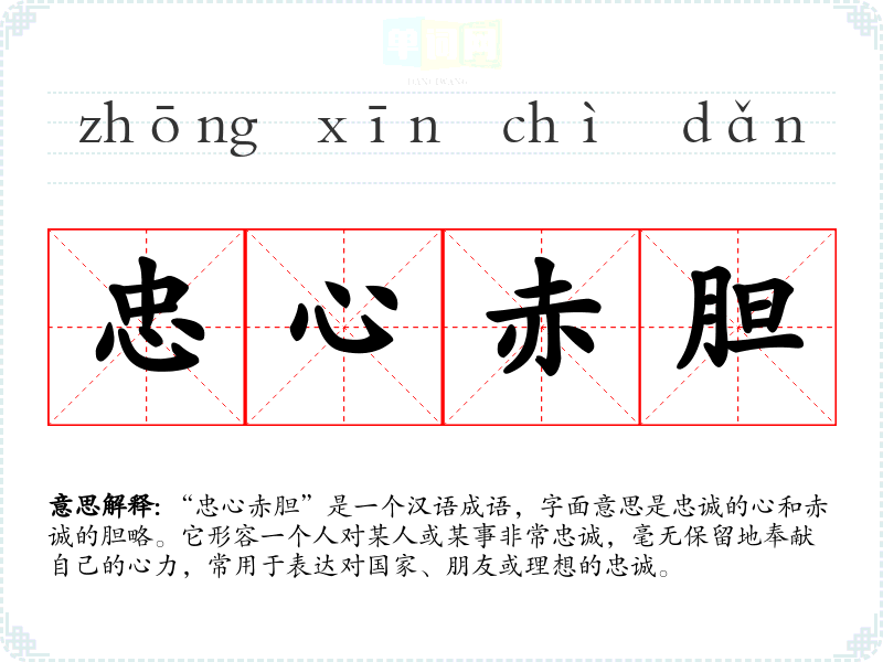 “忠心赤胆”是一个汉语成语,字面意思是忠诚的心和赤诚的胆略。它形容一个人对某人或某事非常忠诚,毫无保留地奉献自己的心力,常用于表达对国家、朋友或理想的忠诚。