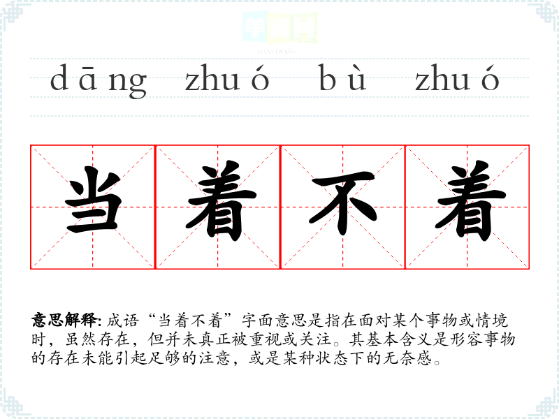 成语“当着不着”字面意思是指在面对某个事物或情境时,虽然存在,但并未真正被重视或关注。其基本含义是形容事物的存在未能引起足够的注意,或是某种状态下的无奈感。