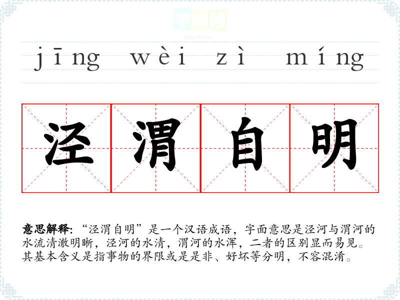 | 清渭浊泾 | 渭河水清,泾河水浑,泾河的水流入渭河时,清浊不混。比喻界限清楚或是非分明。 |