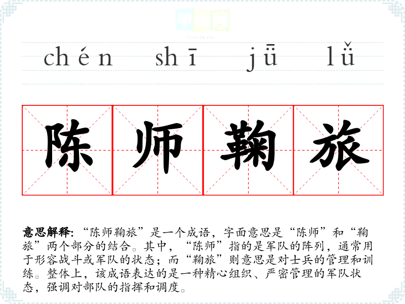 “陈师鞠旅”是一个成语,字面意思是“陈师”和“鞠旅”两个部分的结合。其中,“陈师”指的是军队的阵列,通常用于形容战斗或军队的状态;而“鞠旅”则意思是对士兵的管理和训练。整体上,该成语表达的是一种精心组织、严密管理的军队状态,强调对部队的指挥和调度。