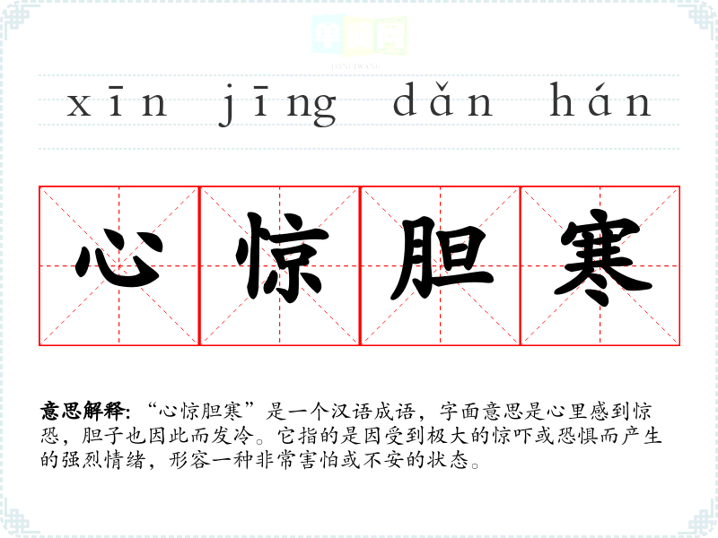 “心惊胆寒”是一个汉语成语,字面意思是心里感到惊恐,胆子也因此而发冷。它指的是因受到极大的惊吓或恐惧而产生的强烈情绪,形容一种非常害怕或不安的状态。