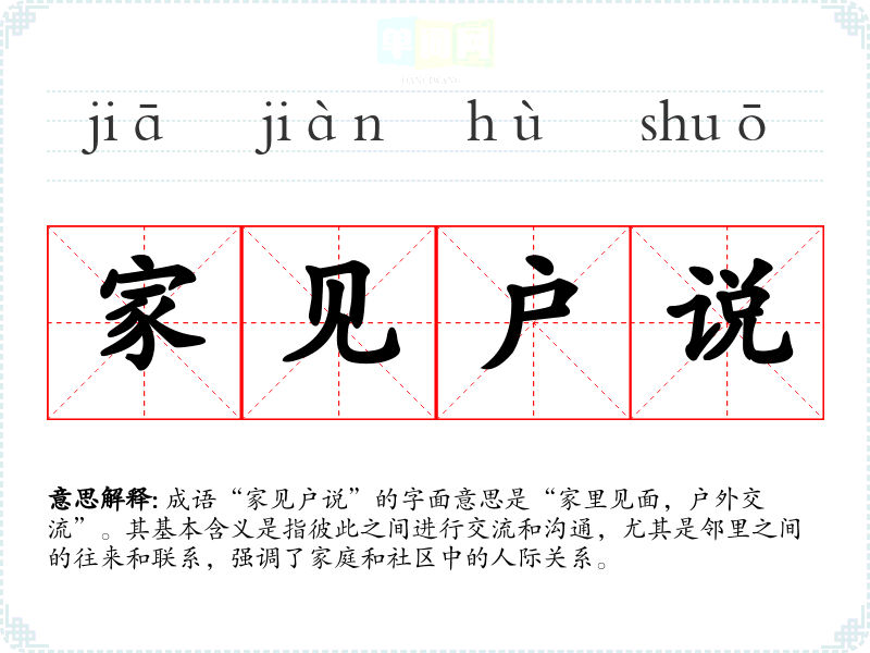 “家见户说”并没有明确的文学典故或历史背景,它更像是一个来自于日常生活的口语表达,反映了**传统社会中邻里关系的重要性。在古代,邻里之间的交流不仅限于礼节性的问候,也包含了相互扶持、分享信息的功能,因此这个成语可以看作是对这种社会现象的总结。