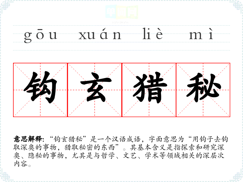 | 钩玄猎秘 | 探取精微,搜寻奥秘。 |