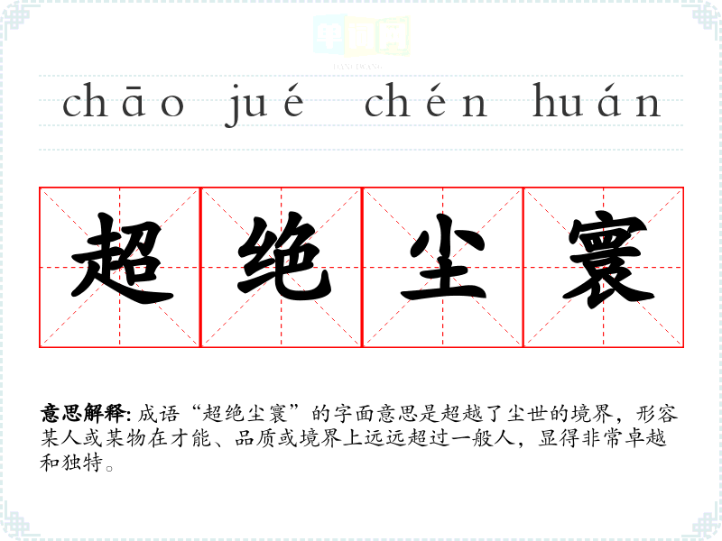 成语“超绝尘寰”的字面意思是超越了尘世的境界,形容某人或某物在才能、品质或境界上远远超过一般人,显得非常卓越和独特。