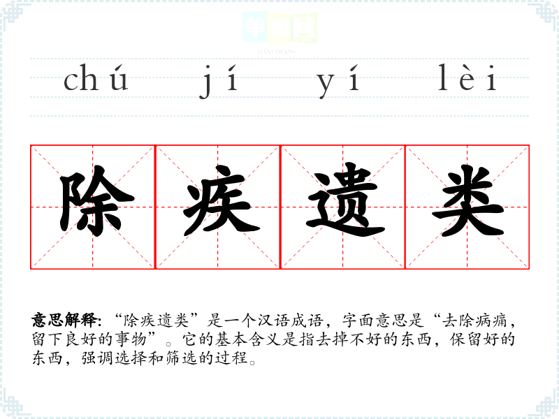 “除疾遗类”是一个汉语成语,字面意思是“去除病痛,留下良好的事物”。它的基本含义是指去掉不好的东西,保留好的东西,强调选择和筛选的过程。