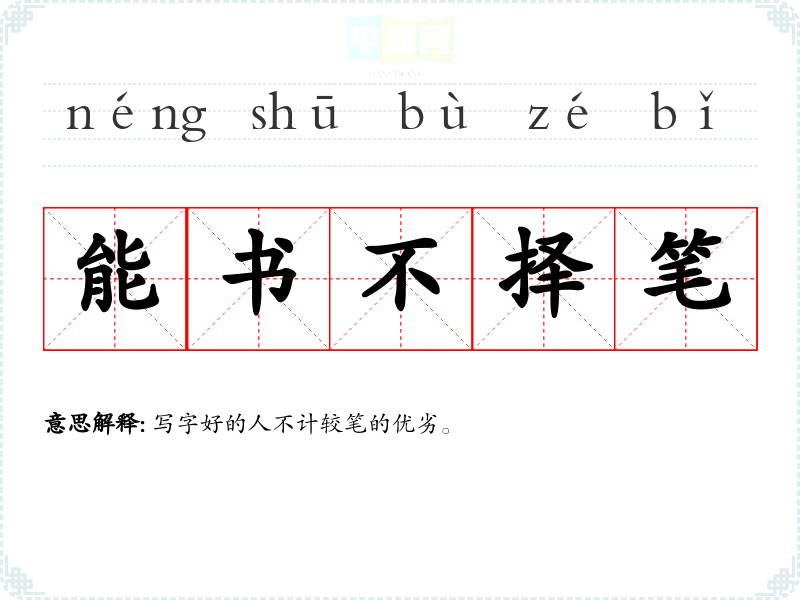 | 能书不择笔 | 写字好的人不计较笔的优劣。 |