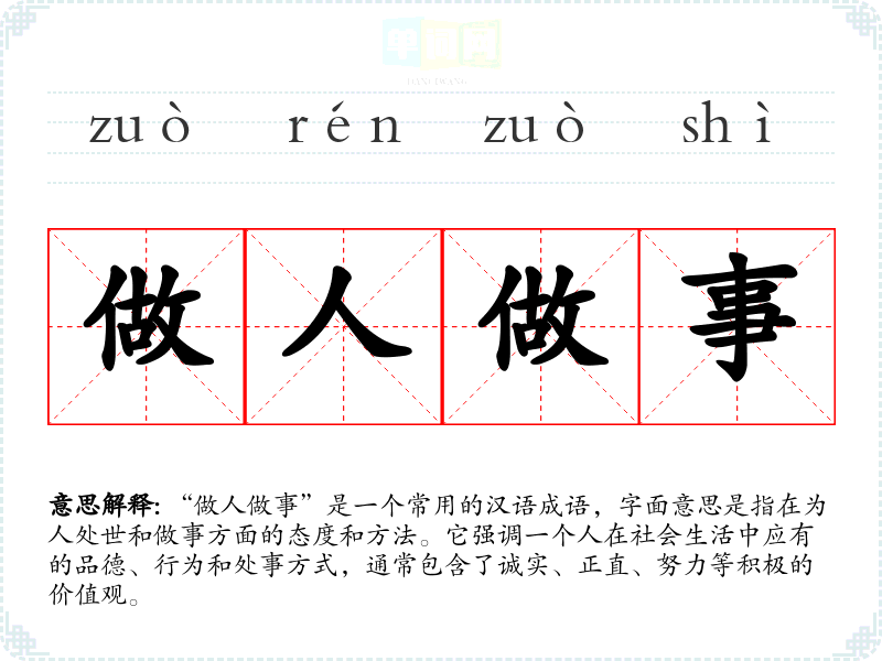 “做人做事”是一个常用的汉语成语,字面意思是指在为人处世和做事方面的态度和方法。它强调一个人在社会生活中应有的品德、行为和处事方式,通常包含了诚实、正直、努力等积极的价值观。