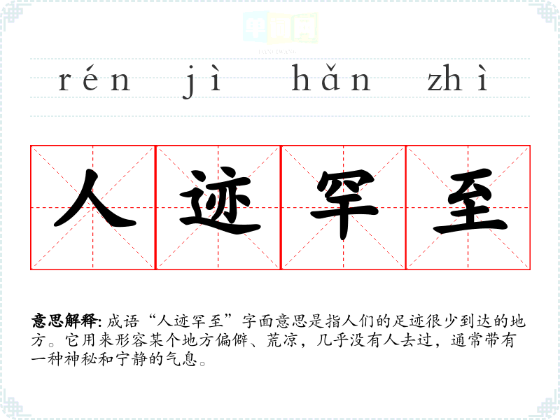 成语“人迹罕至”字面意思是指人们的足迹很少到达的地方。它用来形容某个地方偏僻、荒凉,几乎没有人去过,通常带有一种神秘和宁静的气息。