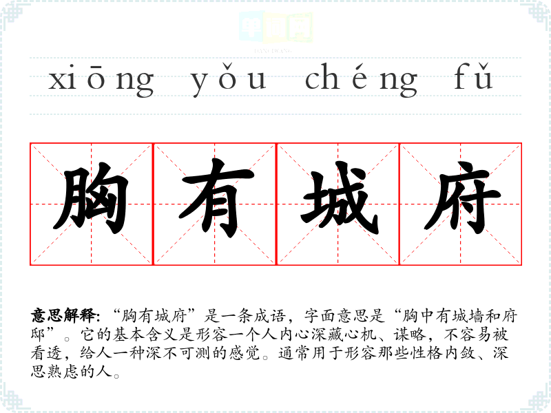 - 演讲:在讨论人际关系或领导力时,提到“胸有城府”可以强调深思熟虑的重要性。