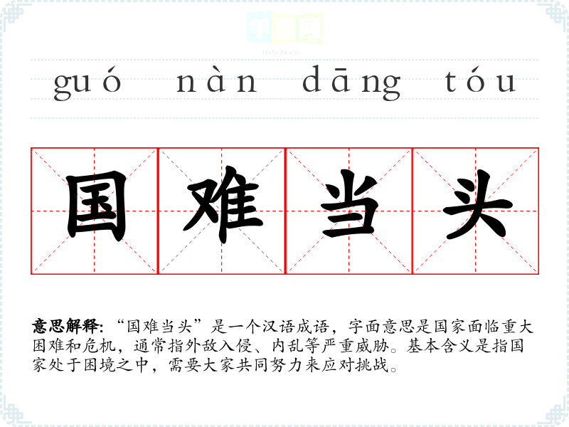 “国难当头”是一个汉语成语,字面意思是国家面临重大困难和危机,通常指外敌入侵、内乱等严重威胁。基本含义是指国家处于困境之中,需要大家共同努力来应对挑战。