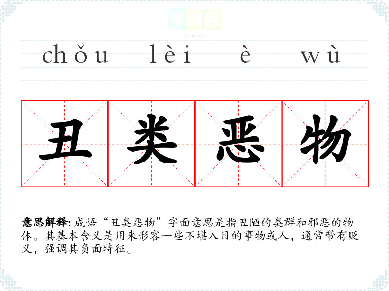 成语“丑类恶物”字面意思是指丑陋的类群和邪恶的物体。其基本含义是用来形容一些不堪入目的事物或人,通常带有贬义,强调其负面特征。