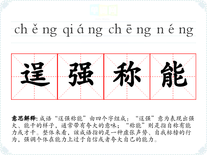 成语“逞强称能”由四个字组成:“逞强”意为表现出强大、能干的样子,通常带有夸大的意味;“称能”则是指自称有能力或才干。整体来看,该成语指的是一种虚张声势、自我标榜的行为,强调个体在能力上过于自信或者夸大自己的能力。