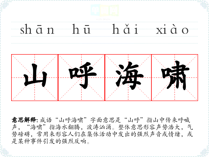 成语“山呼海啸”字面意思是“山呼”指山中传来呼喊声,“海啸”指海水翻腾,波涛汹涌。整体意思形容声势浩大,气势磅礴,常用来形容人们在集体活动中发出的强烈声音或情绪,或是某种**引发的强烈反响。