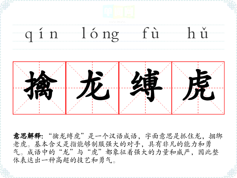 “擒龙缚虎”是一个汉语成语,字面意思是抓住龙,捆绑**。基本含义是指能够制服强大的对手,具有非凡的能力和勇气。成语中的“龙”与“虎”都象征着强大的力量和威严,因此整体表达出一种高超的技艺和勇气。