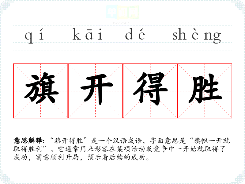 “旗开得胜”是一个汉语成语,字面意思是“旗帜一开就取得胜利”。它通常用来形容在某项活动或竞争中一开始就取得了成功,寓意顺利开局,预示着后续的成功。