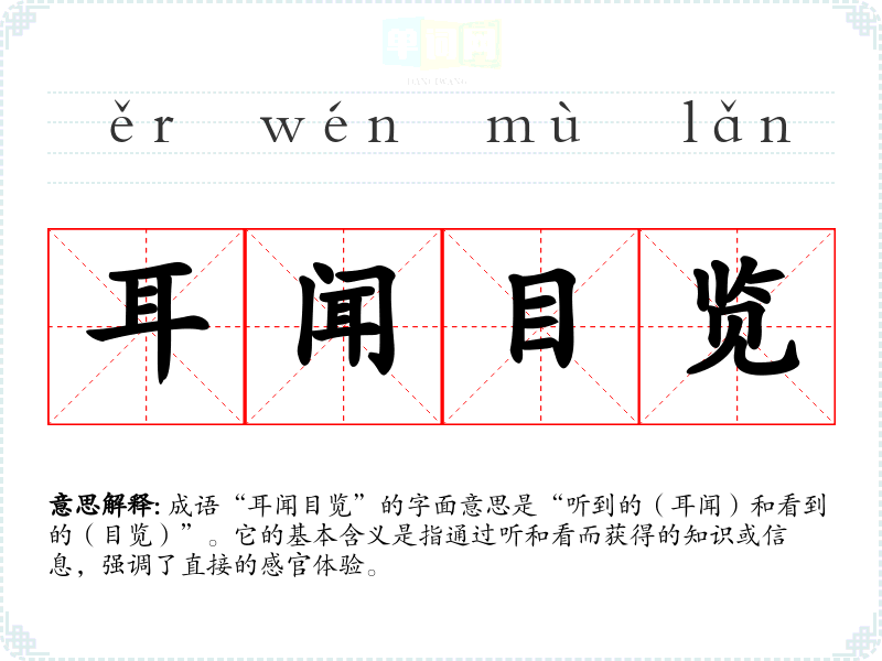 成语“耳闻目览”的字面意思是“听到的(耳闻)和看到的(目览)”。它的基本含义是指通过听和看而获得的知识或信息,强调了直接的感官体验。