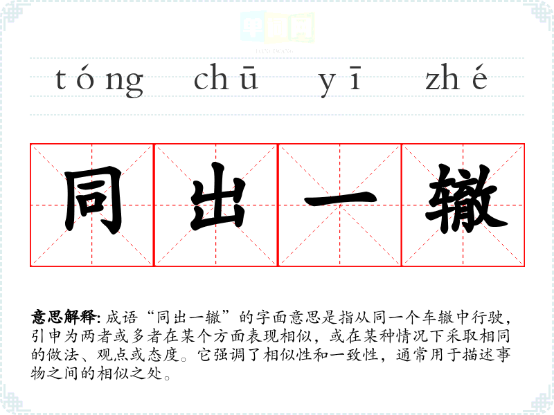 成语“同出一辙”的字面意思是指从同一个车辙中行驶,引申为两者或多者在某个方面表现相似,或在某种情况下采取相同的做法、观点或态度。它强调了相似性和一致性,通常用于描述事物之间的相似之处。