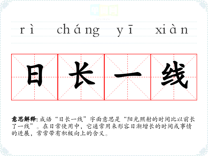成语“日长一线”字面意思是“阳光照射的时间比以前长了一线”。在日常使用中,它通常用来形容日渐增长的时间或事情的进展,常常带有积极向上的含义。