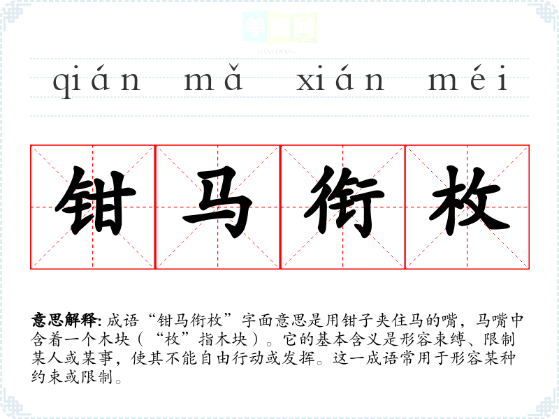 成语“钳马衔枚”字面意思是用钳子夹住马的嘴,马嘴中含着一个木块(“枚”指木块)。它的基本含义是形容束缚、限制某人或某事,使其不能自由行动或发挥。这一成语常用于形容某种约束或限制。