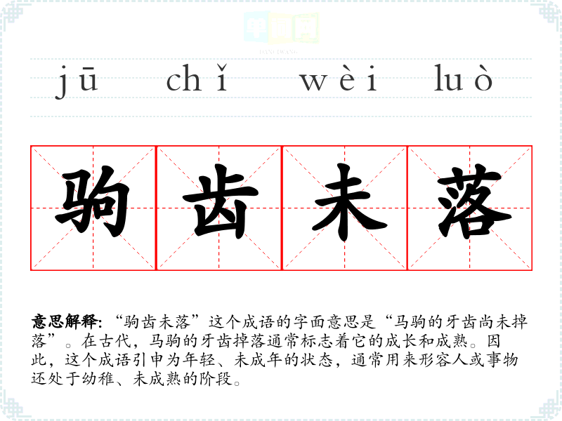 “驹齿未落”这个成语的字面意思是“马驹的牙齿尚未掉落”。在古代,马驹的牙齿掉落通常标志着它的成长和成熟。因此,这个成语引申为年轻、未成年的状态,通常用来形容人或事物还处于幼稚、未成熟的阶段。