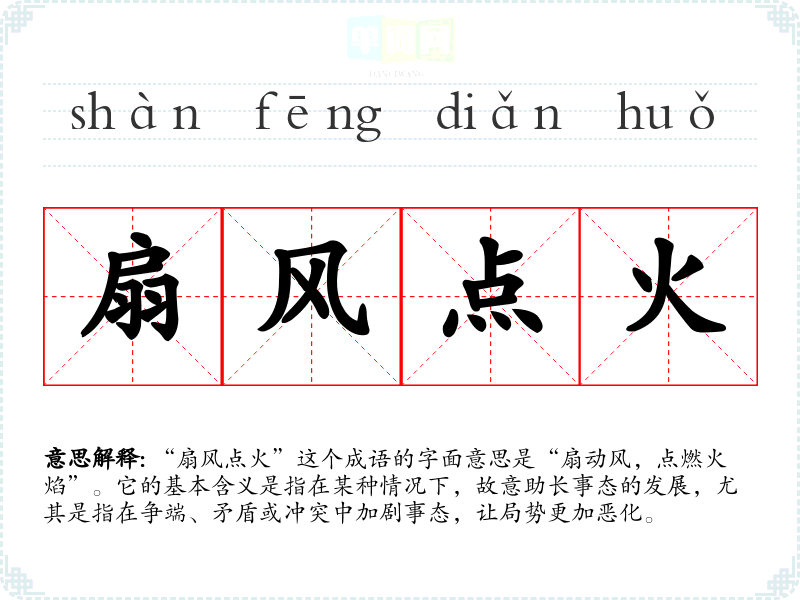 “扇风点火”这个成语的字面意思是“扇动风,点燃火焰”。它的基本含义是指在某种情况下,故意助长事态的发展,尤其是指在争端、矛盾或冲突中加剧事态,让局势更加恶化。