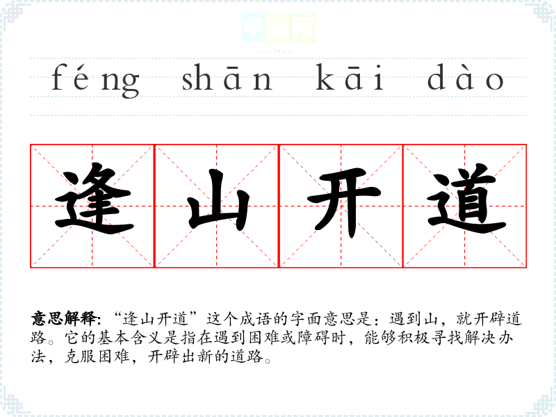 “逢山开道”这个成语的字面意思是:遇到山,就开辟道路。它的基本含义是指在遇到困难或障碍时,能够积极寻找解决办法,克服困难,开辟出新的道路。