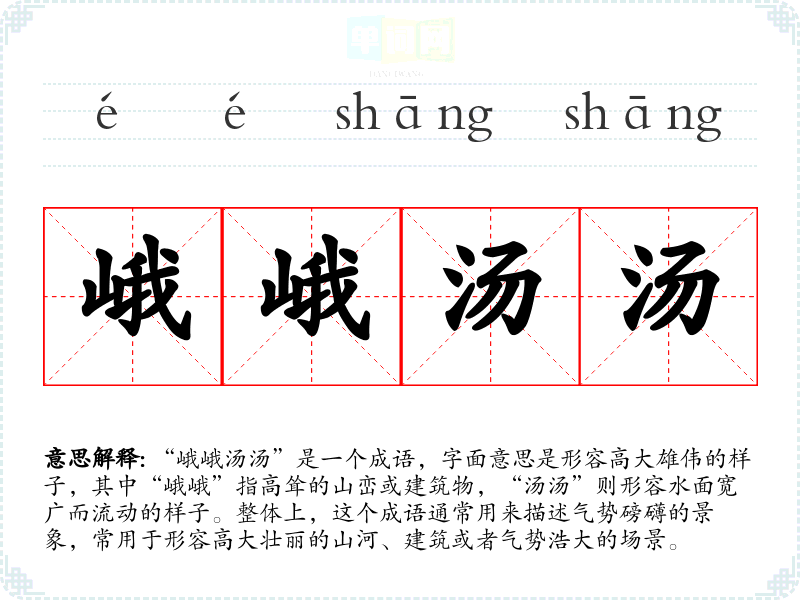 “峨峨汤汤”是一个成语,字面意思是形容高大雄伟的样子,其中“峨峨”指高耸的山峦或建筑物,“汤汤”则形容水面宽广而流动的样子。整体上,这个成语通常用来描述气势磅礴的景象,常用于形容高大壮丽的山河、建筑或者气势浩大的场景。