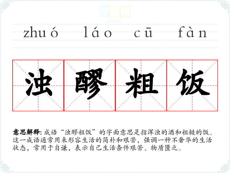 成语“浊醪粗饭”的字面意思是指浑浊的酒和粗糙的饭。这一成语通常用来形容生活的简朴和艰苦,强调一种不奢华的生活状态,常用于自谦,表示自己生活条件艰苦、物质匮乏。