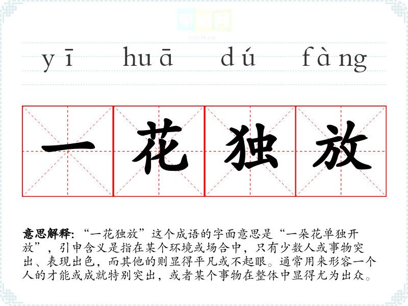 “一花独放”这个成语的字面意思是“一朵花单独开放”,引申含义是指在某个环境或场合中,只有少数人或事物突出、表现出色,而其他的则显得平凡或不起眼。通常用来形容一个人的才能或成就特别突出,或者某个事物在整体中显得尤为出众。