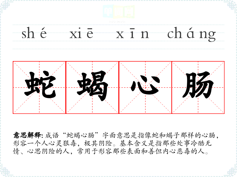 成语“蛇蝎心肠”字面意思是指像蛇和蝎子那样的心肠,形容一个人心灵狠毒,极其阴险。基本含义是指那些处事冷酷无情、心思阴险的人,常用于形容那些表面和善但内心恶毒的人。