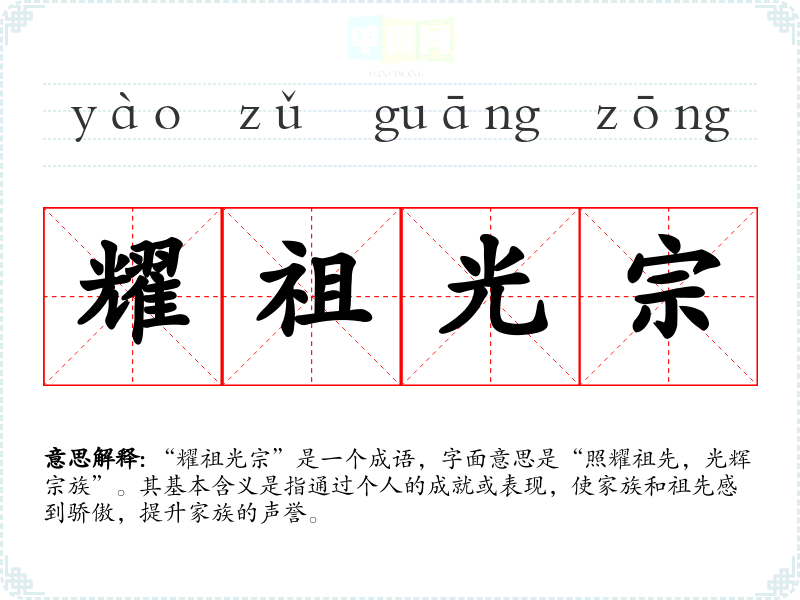 “耀祖光宗”是一个成语,字面意思是“照耀祖先,光辉宗族”。其基本含义是指通过个人的成就或表现,使家族和祖先感到骄傲,提升家族的声誉。