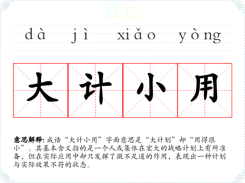 成语“大计小用”字面意思是“大计划”却“用得很小”。其基本含义指的是一个人或集体在宏大的战略计划上有所准备,但在实际应用中却只发挥了微不足道的作用,表现出一种计划与实际效果不符的状态。