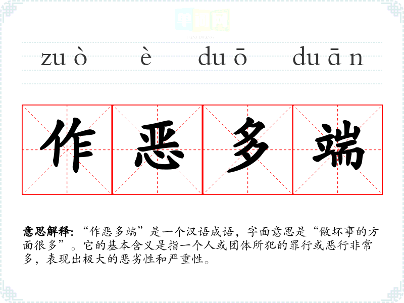 “作恶多端”是一个汉语成语,字面意思是“做坏事的方面很多”。它的基本含义是指一个人或团体所犯的罪行或恶行非常多,表现出极大的恶劣性和严重性。