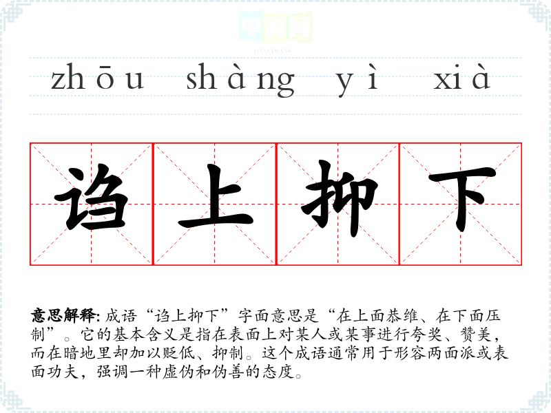 成语“诌上抑下”字面意思是“在上面恭维、在下面压制”。它的基本含义是指在表面上对某人或某事进行夸奖、赞美,而在暗地里却加以贬低、抑制。这个成语通常用于形容两面派或表面功夫,强调一种虚伪和伪善的态度。