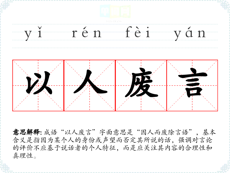 成语“以人废言”字面意思是“因人而废除言语”,基本含义是指因为某个人的身份或声望而否定其所说的话,强调对言论的评价不应基于说话者的个人特征,而是应关注其内容的合理性和真理性。
