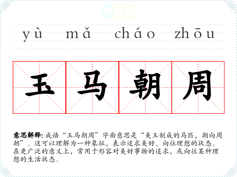 在**文化中,玉马象征着高贵和理想,而周朝则代表着一个理想的政治和社会状态。因此,“玉马朝周”不仅反映了个人对理想生活的追求,也体现了对社会和时代的期望。在现代社会中,这个成语仍然适用,激励人们追求更美好的人生。