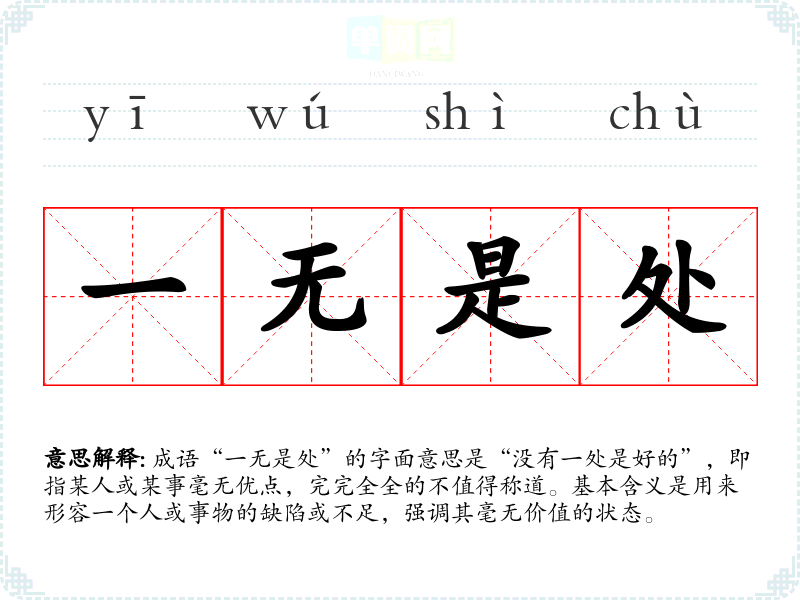 成语“一无是处”的字面意思是“没有一处是好的”,即指某人或某事毫无优点,完完全全的不值得称道。基本含义是用来形容一个人或事物的缺陷或不足,强调其毫无价值的状态。