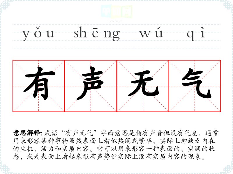 成语“有声无气”字面意思是指有声音但没有气息,通常用来形容某种事物虽然表面上看似热闹或繁华,实际上却缺乏内在的生机、活力和实质内容。它可以用来形容一种表面的、空洞的状态,或是表面上看起来很有声势但实际上没有实质内容的现象。