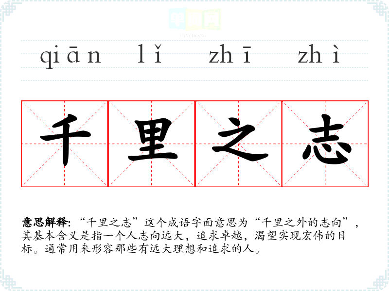 “千里之志”这个成语字面意思为“千里之外的志向”,其基本含义是指一个人志向远大,追求卓越,渴望实现宏伟的目标。通常用来形容那些有远大理想和追求的人。