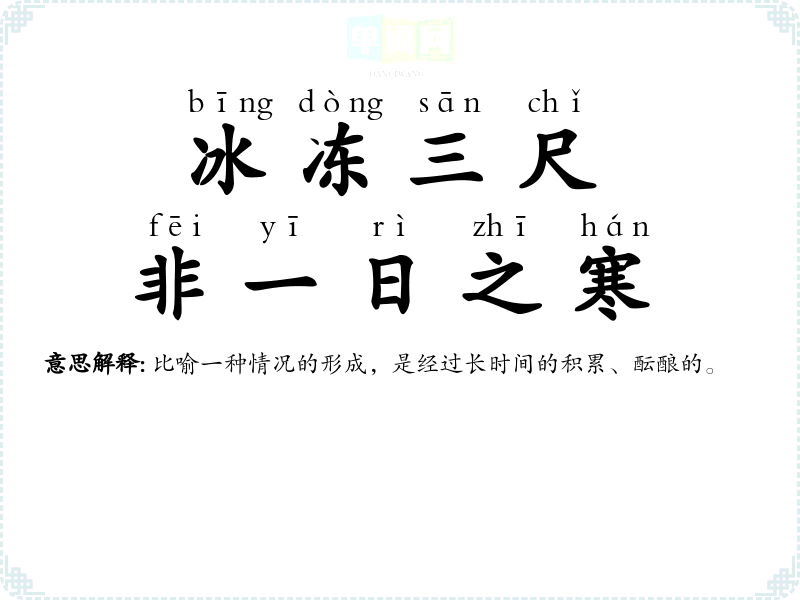 | 冰厚三尺,非一日之寒 | 非:不是;寒:冷。冰冻到三尺厚,不是一天冷造成的。比喻某一种情况的形成,是经过长时间酝酿、积累的结果。 |