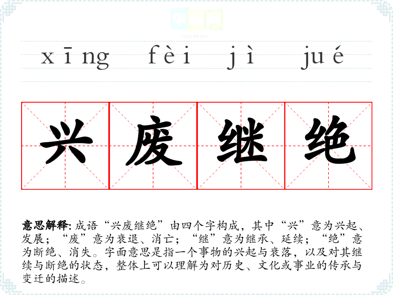 成语“兴废继绝”由四个字构成,其中“兴”意为兴起、发展;“废”意为衰退、消亡;“继”意为继承、延续;“绝”意为断绝、消失。字面意思是指一个事物的兴起与衰落,以及对其继续与断绝的状态,整体上可以理解为对历史、文化或事业的传承与变迁的描述。