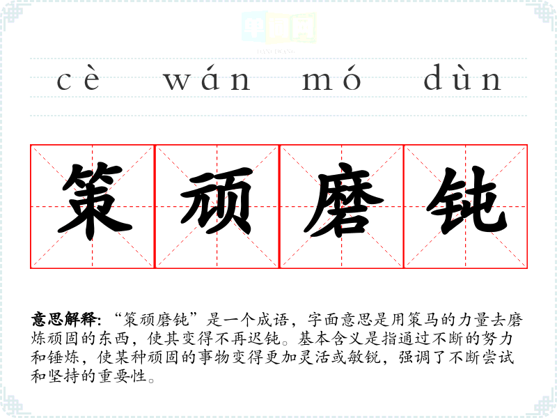 “策顽磨钝”是一个成语,字面意思是用策马的力量去磨炼顽固的东西,使其变得不再迟钝。基本含义是指通过不断的努力和锤炼,使某种顽固的事物变得更加灵活或敏锐,强调了不断尝试和坚持的重要性。