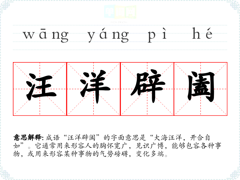 成语“汪洋辟阖”的字面意思是“大海汪洋,开合自如”。它通常用来形容人的胸怀宽广,见识广博,能够包容各种事物,或用来形容某种事物的气势磅礴,变化多端。