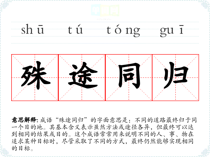 成语“殊途同归”的字面意思是:不同的道路最终归于同一个目的地。其基本含义表示虽然方法或途径各异,但最终可以达到相同的结果或目的。这个成语常常用来说明不同的人、事、物在追求某种目标时,尽管采取了不同的方式,最终仍然能够实现相同的目标。