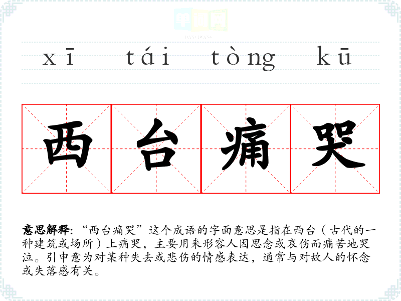 “西台痛哭”出自《洛神赋》,其中提及了曹植对其亡妻的深切怀念与悲痛,西台作为一个象征性的地点,代表着思念和哀伤的情感。这个成语的历史背景与古代文人对情感的细腻描写密切相关,体现了古人对于失去的感伤。