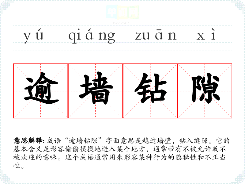 成语“逾墙钻隙”字面意思是越过墙壁,钻入缝隙。它的基本含义是形容偷偷摸摸地进入某个地方,通常带有不被允许或不被欢迎的意味。这个成语通常用来形容某种行为的隐秘性和不正当性。