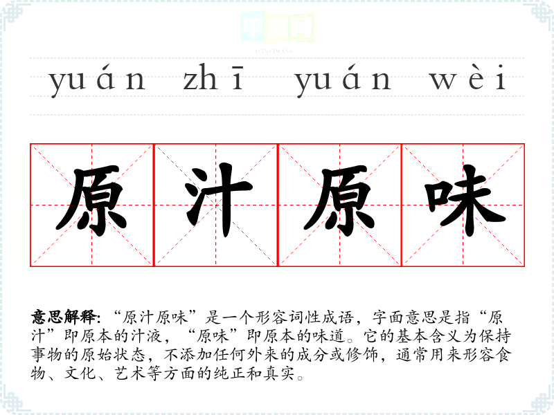 | 原汁原味 | 食物原有的味道和汤汁。比喻事物的原貌或原有特点。 |